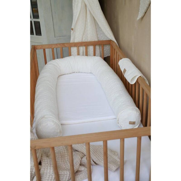 Dit multifunctionele babynest is iets groter dan het standaard babynest uit andere babyly collecties. Het is gemaakt van drie basisonderdelen: matras, rol - die later kan worden gebruikt als bumper voor een kinderbedje, en vervolgens voor het eerste bed en verbindingsstuk. U kunt de hoes van de matras en de roller verwijderen en wassen zonder de inzetstukken. We hebben het babynest voorzien van een draagbeugel, zodat het voor ouders makkelijker te dragen is als ze een baby in de hand hebben.